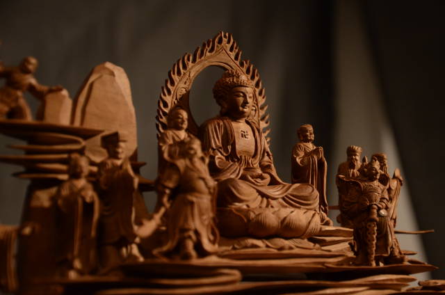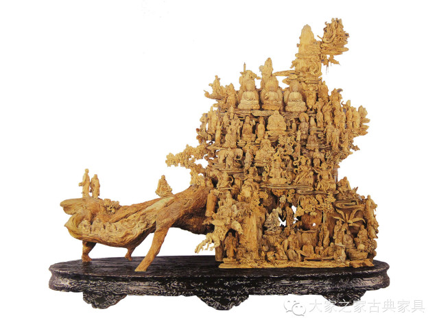 “我办艺雕厂的时候,檀香工艺品在国内还不流行,主要销往台湾、日本、东南亚等地区,为了迎合市场,跑遍了港台和东南亚地区,翻阅了大量资料。我发现关公和佛教等题材很受欢迎,于是开始深入研究,后来成为企业发展的一个契机,同时,也为自己打下了文化基础。”