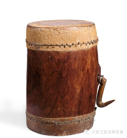 林庆财对黄花梨极度钟情,使他变得格外惜物。他已经记不清多少次下海南寻料,寻料的过程,充满了传奇。在大家之家黄花梨艺术馆二层的臻品厅,赫然陈列着一只黄花梨鼓,直径约一尺半,高约两尺;为整木掏空,鼓面绷鹿皮,鹿角做挂钩,因为经年使用鼓身已经形成厚厚的皮壳,皮壳下依然透显出绚丽的花纹,使整只鼓看上去,内敛而张扬得恰到好处。