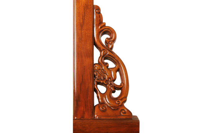 「扶手」前端卷草纹图案构思严谨,内部精雕细琢,不一丝拖沓。