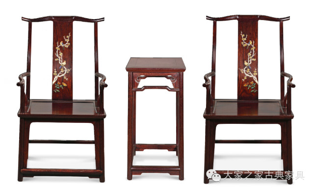 林锐群设计监製 紫檀嵌百宝花鸟纹四出头官帽椅一对带几 成交价:586,500(RMB,元)