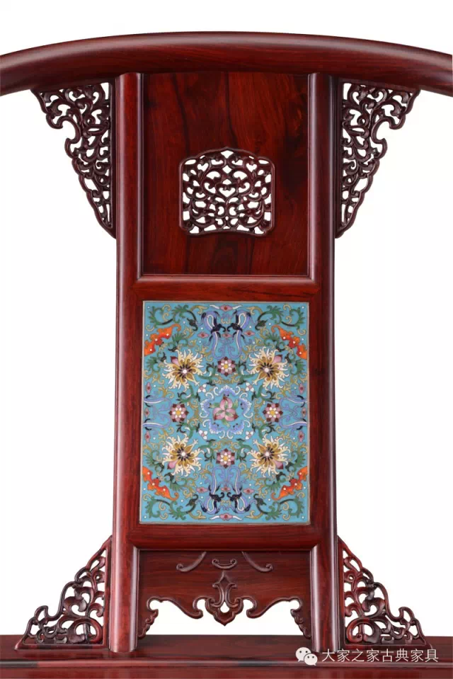 对于林锐群来说,任何时候都是要用好设计来说话的,此款皇宫椅融入了他对家具的理解,「后背」中部采用了以传统的掐丝珐琅、大漆等为代表的图案,结合的十分恰到好处,更增添了几分色彩,让这件家具在众多的托泥圈椅里脱颖而出。